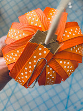 My grandchildren are back in school, so now is a good time to start prepping Halloween decorations for outside and adding fall decorations inside to add a warm, cozy feeling to my home. Pumpkins are a favorite accent. so making a few small ones seemed like a good place to start. Can you believe this cute pumpkin pick was made from ribbon and a toilet paper roll!